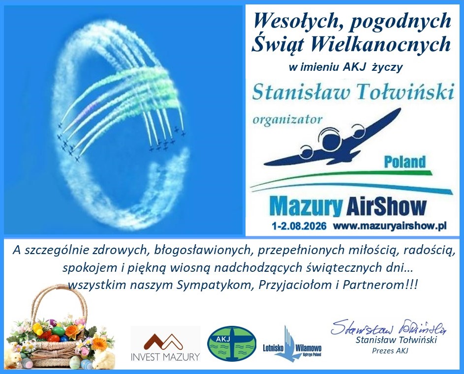 Zbliżające się Święta Wielkiej Nocy, obligują nas (i nie tylko nas) do pewnych osobistych refleksji i „remanentu” aktualnego stanu rozrzuconego w wielu miejscach grona przyjaciół i życzliwych nam osób. Przygotowując się, do zapewne rodzinnego świętowania, z niepokojem obserwujemy tragiczną dla wielu rodzin zbrodniczą agresję Rosji, na sąsiadów, na Ukrainie ale i zbrojny konflikt w rejonie Zatoki Perskiej, zaczyna być odczuwalny dla nas. Nie zapominając o tych tragicznych wydarzeniach, proszę o przyjęcie od nas (z Aeroklubu Krainy Jezior, Lotniska Wilamowo i Majątku Wajsznory) życzenia spokojnych i radosnych Świąt Wielkanocnych, niech w Waszych sercach zagości wiara, nadzieja, życzliwość i miłość. By te świąteczne dni stały się źródłem wzmacniania, napełniania pokojem i optymizmem na przyszłość. Życzymy również dobrego odpoczynku, kolorowych pisanek, smacznego jajka, zajączka z obfitymi darami, mokrego Śmigusa Dyngusa oraz samych słonecznych, spokojnych i cudownych dni. A w pierwszy weekend sierpnia (1-2.08), do zobaczenia podczas 25-tej JUBILEUSZOWEJ edycji pn. Mazury AirShow 2026, na historycznym lotnisku Kętrzyn Wilamowo.
