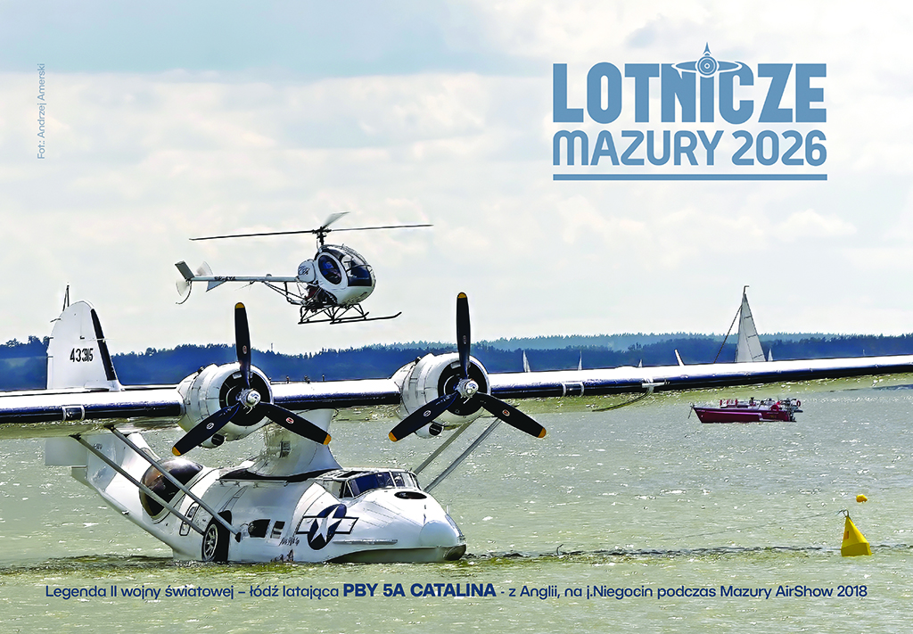 Po lewo prezentujemy wizualizację kalendarza „Lotnicze Mazury 2026” z wykorzystaniem zdjęć Andrzeja Amerskiego.